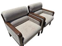 カリモクの応接セットです。3人掛けソファ×1、1人掛けソファ×2、ローテーブルの4点セットです。3人掛けソファ右のひじ掛けに、キズがございます。そのほか目立つシミ・キズはございません。